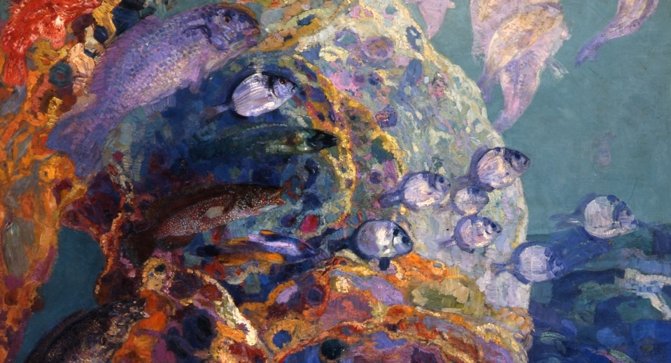 Fondo Marino, de Hermenegildo Anglada Camarasa, centrará la actividad de audiodescripción que, excepcionalmente, estará abierta a todos los públicos. La voz que describe y la música que la acompaña serán las claves para interpretar esta fantástica obra realizada durante la etapa mallorquina del artista, en la que Anglada descubrió los temas submarinos, verdaderos poemas sinfónicos de color.