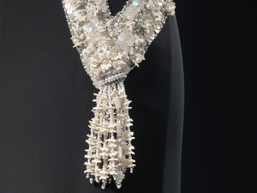 La pieza de Balenciaga Vestido de noche en crespón de seda negro y guarnición de cinta aplicada de lentejuelas, guipur y cristales facetados (1968, Museo Cristóbal Balenciaga de Getaria) es el primer traje que forma parte del Programa La Obra invitada del Museo de Bellas Artes de Asturias, siendo la pieza escogida para el primer cuatrimestre de 2016.