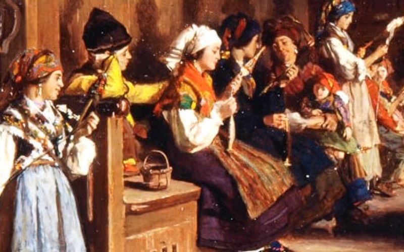 Pueden oyise les cardes cardando llana de oveya xalda; puede oyise la zuela pegando contra una madreña a mediu facer; los panderos cuadraos, el fueu y un cantar.