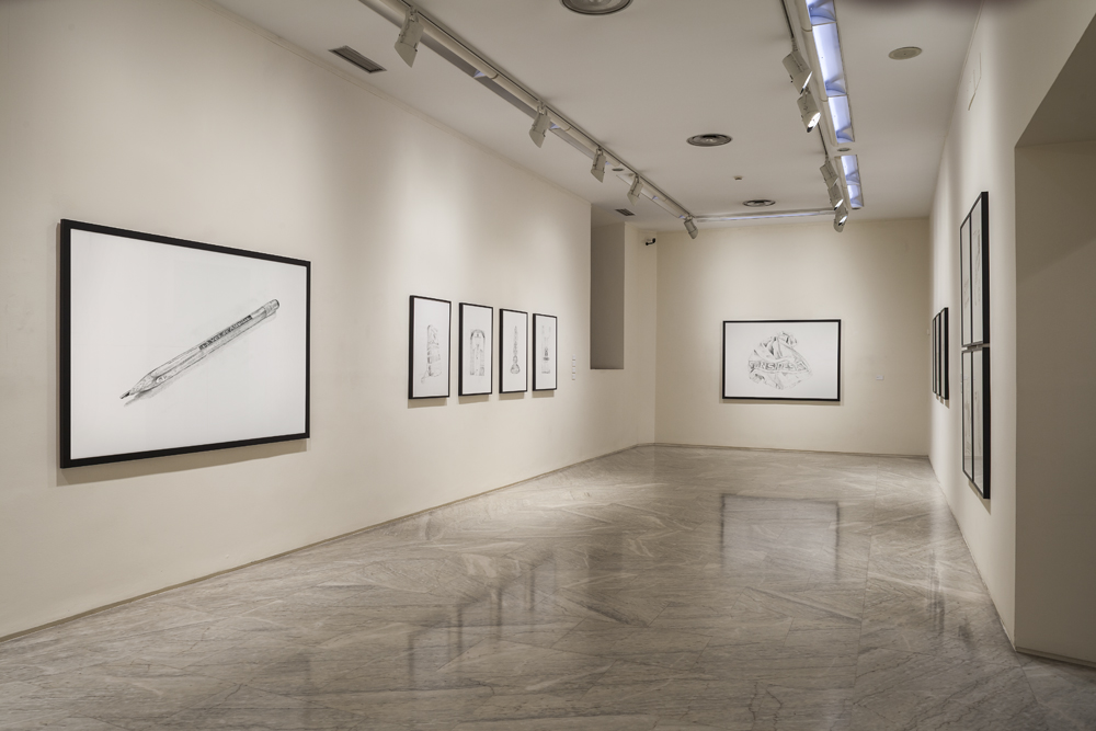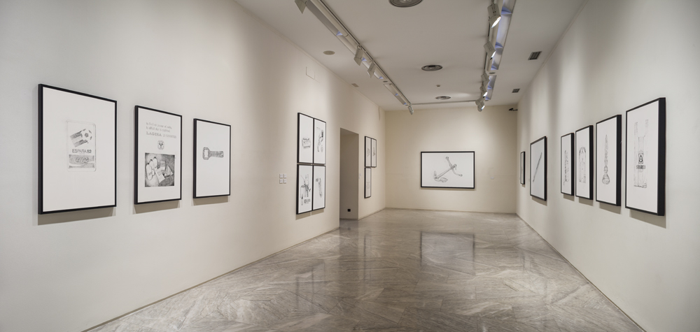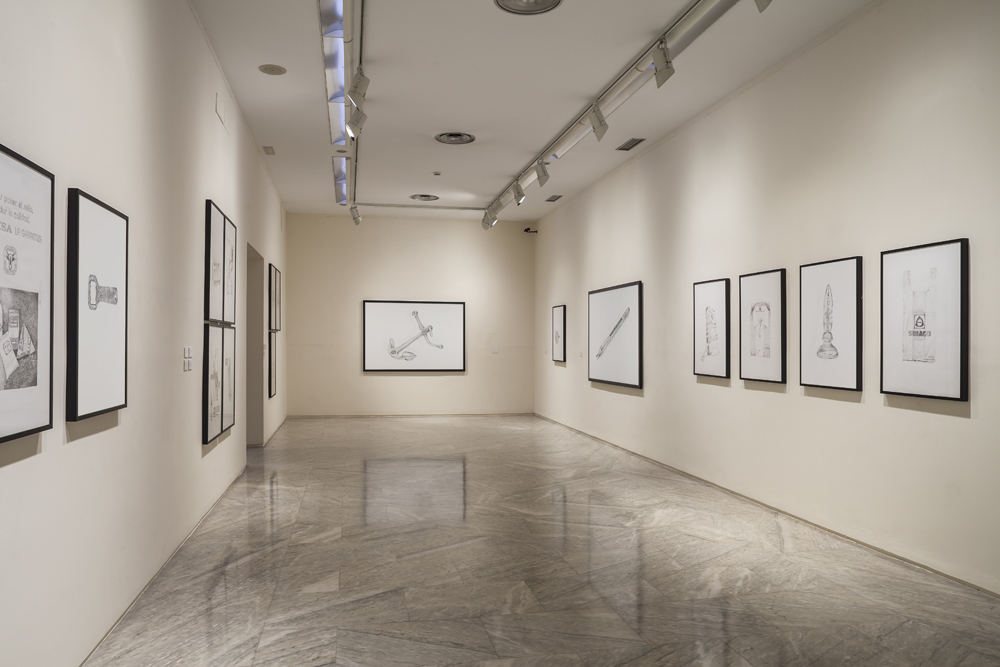 La muestra compartía con la novela no solo el título, sino también su carácter distópico, que el artista veía reflejado en la antiutopía en la que se ha convertido la Asturias actual. Estaba compuesta por casi una veintena de obras, entre dibujos de gran formato y una instalación con forma de alfombra, concebida para ser transitada y que invadía el dieciochesco patio del palacio de Velarde. A través del dibujo, técnica de fuerte raigambre clásica, y de una instalación de intensas connotaciones industriales, el artista asturiano rememoraba objetos de distintas empresas vinculadas al territorio astur: logos, diseños y gadgets de todo tipo que le permiten, partiendo de un elemento concreto, analizar la historia y reflexionar en torno al agotamiento tanto industrial como empresarial de nuestra región. El abrebotellas de Cervezas El Águila Negra, la toalla de Ensidesa, el lápiz de La Voz de Asturias y la bolsa de plástico de Simago eran algunos de esos gadgets desterrados que Sala rescata del olvido. Objetos que, convertidos en iconos, eran también, de alguna manera, mudos testigos de uso, de procesos de desindustrialización y de conflictos laborales que han marcado nuestras vidas. Eran recuerdos que servían al creador para rescatar la memoria personal y colectiva en un ejercicio de recuperación de “otras” historias, esas que quizás no conformaban la versión oficial y que, sin embargo, eran tan importantes para la comunidad. Todo ello para realizar, en suma, y como el propio artista afirmaba, una arqueología de la memoria de una región que se debate entre un pasado en un tiempo de esplendor y un futuro incierto por el que debemos pelear. Y es que la idea de este proyecto no es mantener un discurso apocalíptico gratuito, sino re-localizarnos en un lugar (en este caso, en un “no-lugar”) desde el que intentar cambiar las cosas.
