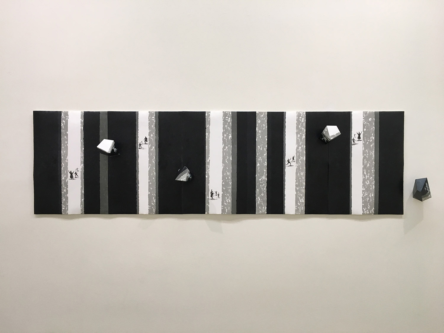 La estructura y montaje de esta instalación se disponen a partir de las estampas serigrafiadas que emergen desde el suelo y se elevan, simulando una corriente de aire, hacia lo alto donde se transmutan en forma de pájaro.