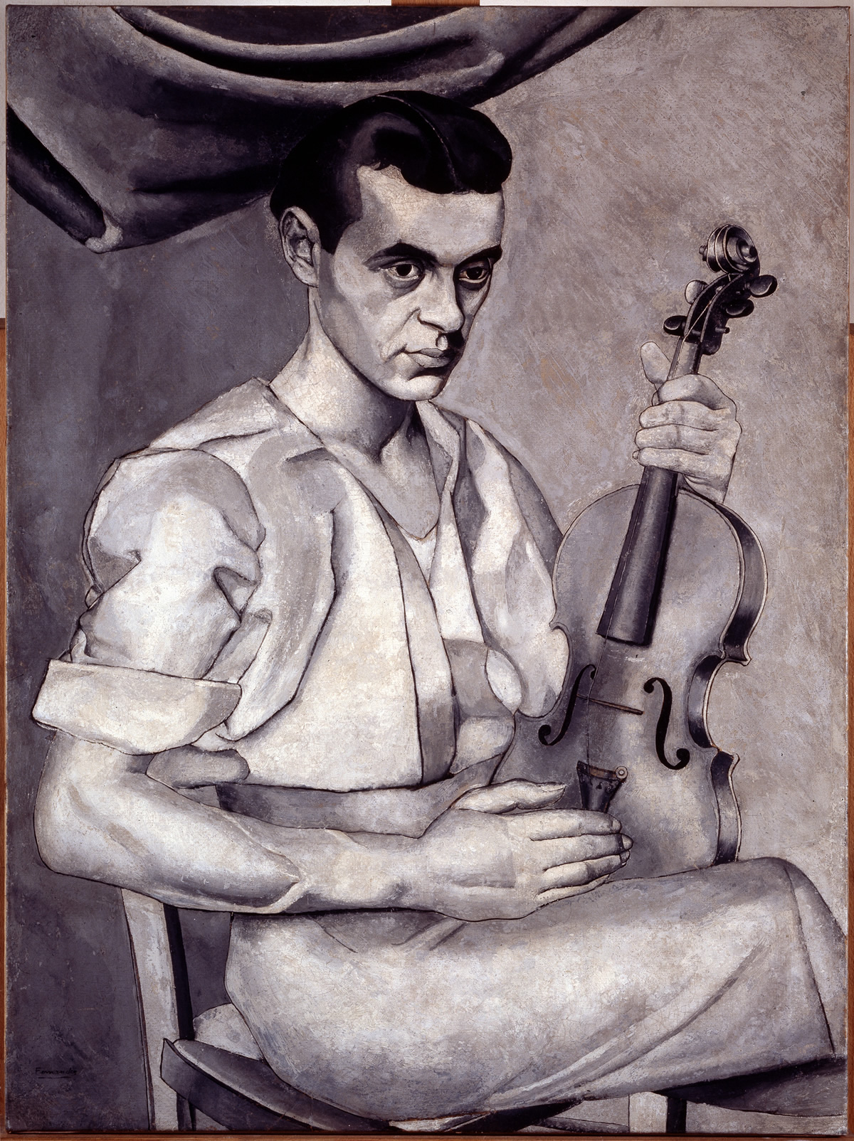 Luis Fernández (Oviedo, 1900-París, 1973) es uno de los creadores españoles más importantes del siglo XX. Tras su marcha a París en 1924, Fernández entró en contacto con lo más granado de la vanguardia internacional, hecho que le sirvió para conocer y profundizar en alguno de los movimientos artísticos más importantes del momento tales como el surrealismo o el cubismo. A partir de la década de los años cincuenta, el artista asturiano alcanzó su etapa de madurez, caracterizada por una peculiar y muy personal figuración, totalmente apartada de las corrientes en boga de la época, que le han convertido en uno de los creadores más singulares de la primera mitad del siglo XX.Esta obra invitada, procedente del Museo Nacional Centro de Arte Reina Sofía de Madrid, representa a un hombre sentado sobre una silla y que sostiene entre sus manos una viola con una única cuerda. Una composición con un marcado aire nostálgico apreciable no sólo en la delgadez, postura y rasgos faciales del retratado sino, también, en la austera y fría gama cromática elegida por Fernández y que relacionan esta obra con uno de los artistas que más interesaron al creador asturiano, Pablo Picasso.