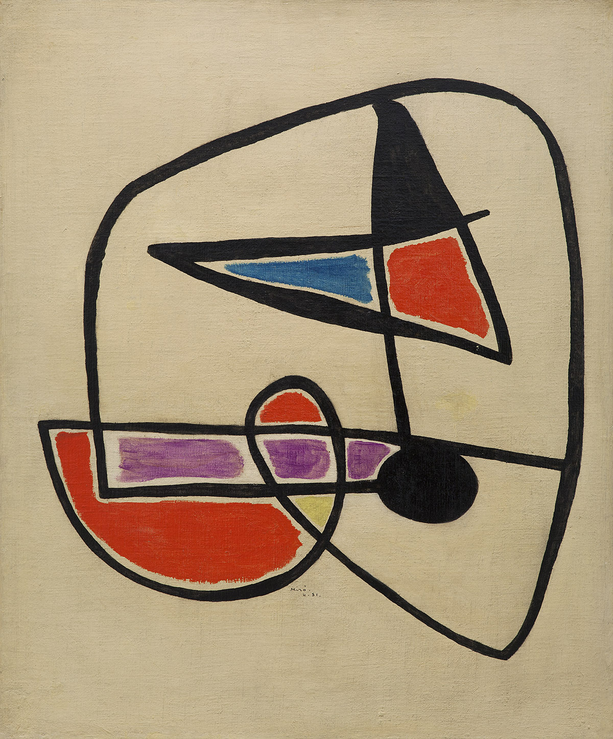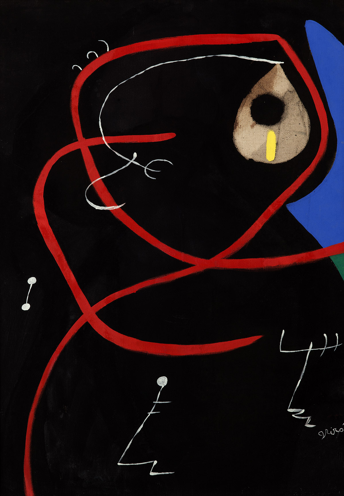 Por su parte, Tête, oiseaux o “Cabeza, pájaros” es un pintura muy posterior. Pertenecen a una etapa en la que la temática mironiana está protagonizada por figuras humanas, cabezas, astros y pájaros. En ellas, lo grotesco está presente pero también el mundo de la noche y los sueños, evidente en la elección del fondo negro.