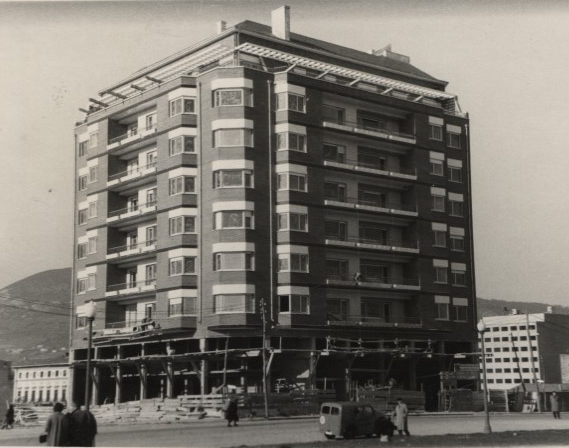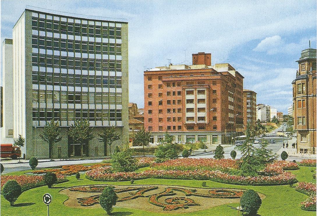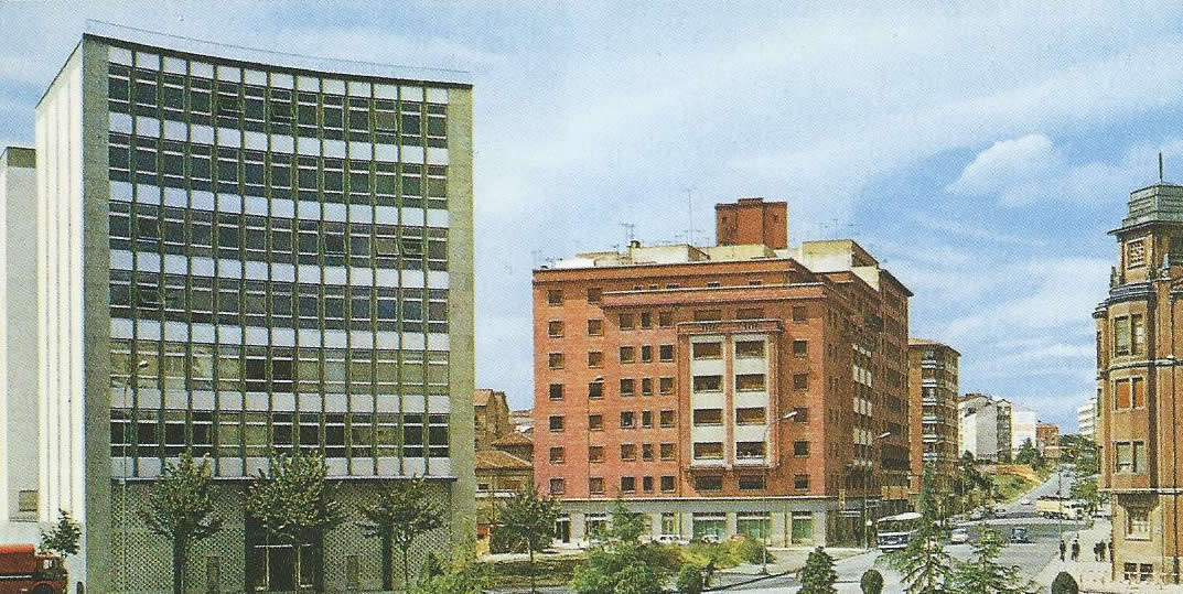Cerramos este texto con el edificio del Colegio de Médicos , en la Plaza de América número 10 de Oviedo. Se trata de un edificio de oficinas de extraordinaria calidad, proyectado en 1962 y cuya fachada, de metódica disposición, se ve favorecida por la curvatura del espacio circular en el que se inserta. La fachada es una retícula compacta de bandas horizontales interrumpidas por nervaduras verticales salientes, todo de aluminio, que descansa sobre una amplia marquesina curvada. Este edificio representa así un vínculo con una modernidad casi intemporal que recorre la arquitectura internacional, desde las obras milanesas de Gio Ponti hasta las americanas de Mies van der Rohe, al que se une, además, un sello de solvencia técnica y elegancia.