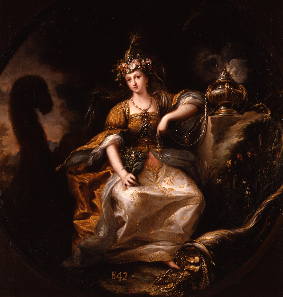 Se identifica la preciosa figura femenina como una Alegoría de Asia por el ramo de flores que lleva en la mano, el incensario aludiendo a las esencias que venían de Oriente y, sobre todo, por el camello, que siempre se asocia con este continente. Meléndez le ha añadido un cuerno de la abundancia a los pies, del que salen ricos tesoros: collares de perlas, cadenas de oro, medallas y monedas, y ha inventado un curioso tocado en el que se combina una preciosa corona de flores, pintadas con la maestría que caracteriza al artista y tan abundantes en sus cuadros religiosos, con un gorro de seda en forma de casco que recuerda a los que se suponía que llevaban los turcos y del que cuelga un velo de fina seda.