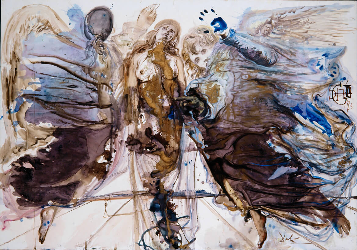 Metamorfosis de ángeles en mariposa, según reza una etiqueta pegada en el marco, es el título de esta obra de Salvador Dalí (Figueres, Girona, 1904-1989), en la que se representa un conjunto de dos ángeles flanqueando una figura femenina desnuda, que semeja una mariposa.