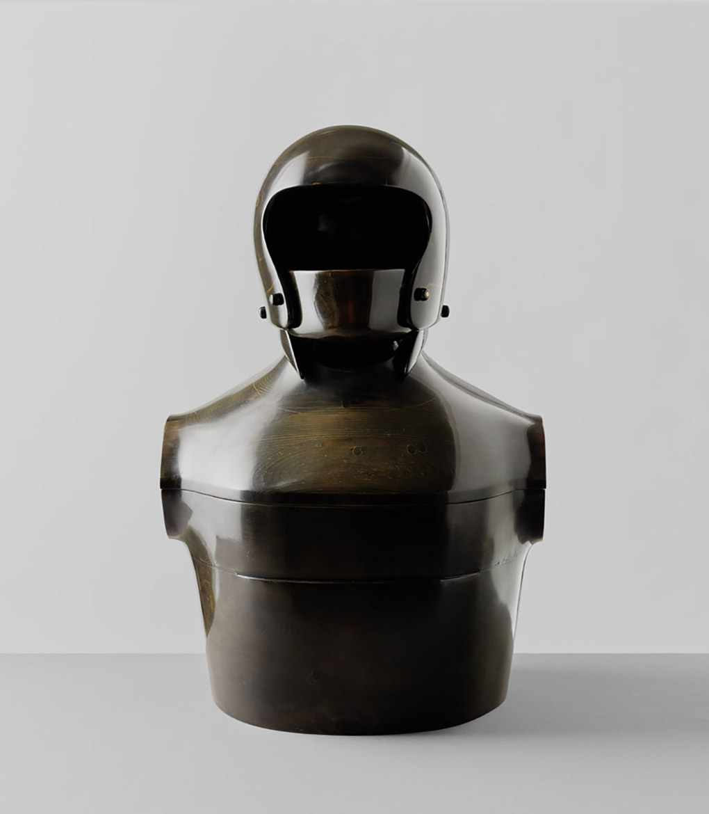 La pieza resume a la perfección algunos de los intereses principales del artista en esta etapa. En primer lugar, la atención al hombre y su relación con la máquina. Así, en esta “cápsula antropomórfica” (como la definió Antonio Gamoneda) se muestra solamente el “envoltorio” del piloto de carreras: el casco y el traje, algo, por tanto, fragmentario y descontextualizado. El artista seleccionaba este tema no sólo por su afición a la velocidad, sino también por su capacidad connotativa, sígnica. Para él, “el piloto de coches de carrera es, a la vez, conductor y conducido. Dominador y atrapado. Abierto y encerrado. Su imagen externa es su propia imagen virtual”.