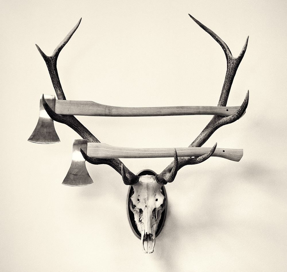 Nuestra siguiente parada es “La cabeza de ciervo, una imagen que recuerdo haber visto con mucha frecuencia en los restaurantes asturianos”, afirma Chema Madoz. Este elemento se puede encontrar, además, en otros proyectos de Miradas de Asturias, como en ARSTUSIA, de Joan Fontcuberta .Con ella Madoz estaba tratando de utilizar un objeto que tiene una presencia especialmente llamativa pero desde una perspectiva distinta. En las astas está presente la evocación del bosque pero aquí se transforman en una especie de armero que en vez de rifles tiene hachas del leñador. Por un lado está presente la idea de la muerte (a través del cráneo) pero tiene también algo de iconográfico, de escudo. Hay además un cierto carácter simbólico por la manera en la que está construida la imagen que le dota de mucha potencia.