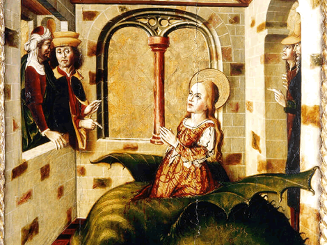 Una de las obras de mayor tamaño que pueden admirarse en el Museo de Bellas Artes de Asturias es el Retablo de Santa Marina, procedente de la iglesia del mismo nombre en Mayorga de Campos (Valladolid). Las veinticuatro tablas que lo componen fueron pintadas hacia 1500 por el Maestro de Palanquinos. El retablo narra la historia de Santa Margarita de Antioquía, identificada en España con Santa Marina de Galicia. Esta obra, es un perfecto ejemplo de los usos iconográficos del último período gótico y con ella conoceremos… ¡al dragón!