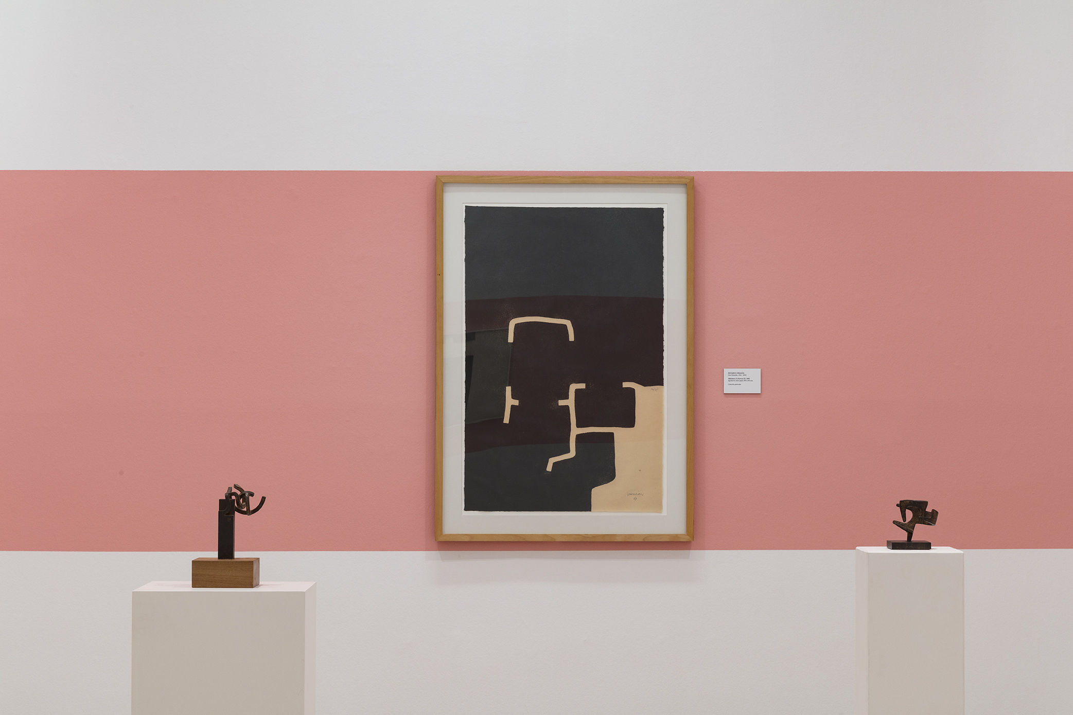 Como contestación a los mismos interrogantes que motivaron sus esculturas, Chillida desarrolló en sus estampas un lenguaje bidimensional específico, fundamentado en la creación de rotundas estructuras de tinta plana negra y sutiles relieves estampados. La variada selección de obra gráfica permite revisar el uso de estos recursos en sus distintas etapas, pues comienza con el primer grabado del artista –creado en 1959– y alcanza sus últimas creaciones de finales de la década de 1990. Dentro de ella, son especialmente significativos los aguafuertes de grandes dimensiones, los pequeños formatos con bordes troquelados, las obras destinadas a libros de artista y los grabados de manos, único motivo figurativo que representó a lo largo de toda su carrera.