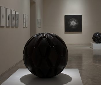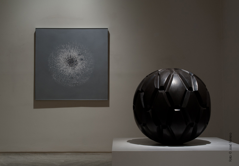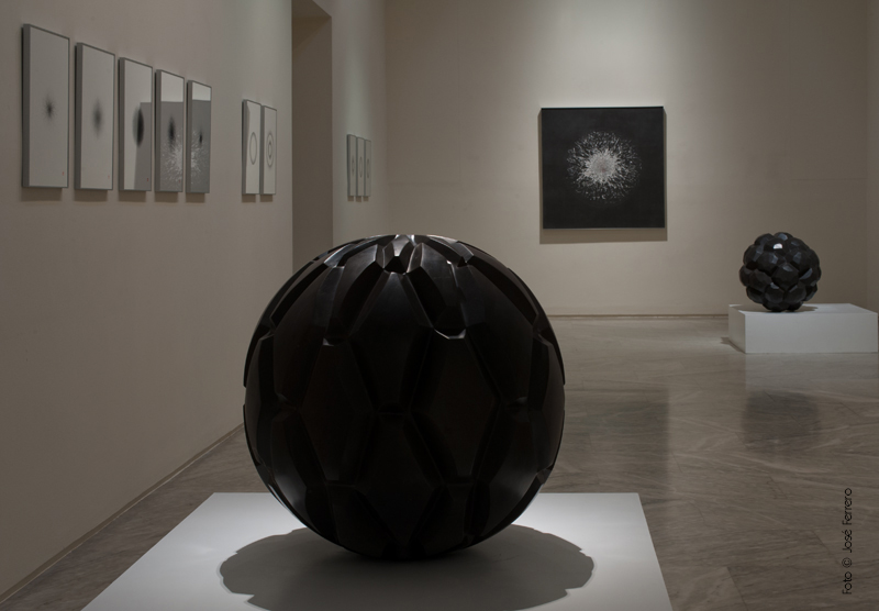 Negro silencio fue un proyecto específicamente diseñado para el Museo de Bellas Artes de Asturias. La muestra estuvo compuesta por una serie de piezas escultóricas, pinturas y dibujos, a través de los cuales el artista japonés reflexionó sobre aspectos tan variados como el origen y la evolución de la vida, los secretos de su formación y el tiempo asociado a la misma, la pervivencia de la energía vinculada a la materia, el misterio insondable de la creación y el papel del artista como demiurgo o hacedor, capaz de insuflar espíritu y aliento poético a todo aquello que toca. Así se apreció en obras como El Transcurrir de la vida…, serie de cuatro piezas instalada en el patio de Velarde que nos mostró la evolución de las formas desde el volumen prístino del cubo perfecto a las formas moleculares, plenas de vida (o de muerte, por asociación con su color negro), presentes en su producción más reciente y moduladas por la mano hábil del artista sobre la dura piedra de Calatorao. Volúmenes pesados (cada pieza supera los 200 kilos de peso) y compactos que contrastaron con la levedad férrica de Hélice y Doble hélice, esculturas instaladas en el mismo patio de Velarde que se desarrollaban como “dibujos en el espacio”, inmortalizando el recorrido y la transformación de la vida. Esta visión se completó en la sala con otras dos estructuras moleculares y, muy especialmente, con sus trabajos sobre el Big Bang, en los que las formas estallaban, nacían y se transformaban a través del fino trazo dibujístico o del kizamu, término polisémico japonés que hace alusión al paso del tiempo pero también a las acciones de rayar, de grabar, y que era utilizado por Tadanori para referirse a una peculiar técnica en la que, a través del paso del tiempo y mediante el rayado insistente (en ocasiones llega hasta las dos mil incisiones) de una mezcla de resina con polvo de mármol, yeso y pintura, conseguía transmitir toda la fuerza expresiva de la gran explosión creadora del Universo.