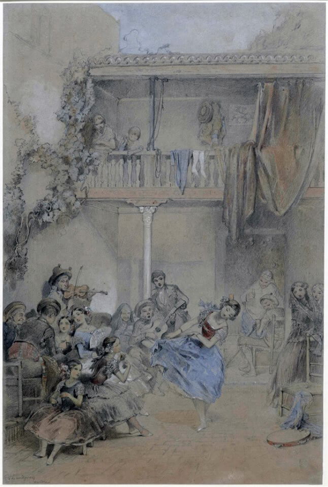 Buen ejemplo de este periodo es esta acuarela, adquirida por el Museo en 2009. En ella se representa el ambiente popular andaluz a través de multitud de personajes que pueblan un patio sevillano. Ejecutada con colores muy pálidos y una suave pincelada, destaca también el carácter idealizado y la refinada estilización de los personajes. La columna del patio está rematada en un capitel árabe, minuciosamente representado, un toque excepcional y exótico para cualquier viajero romántico extranjero por España.