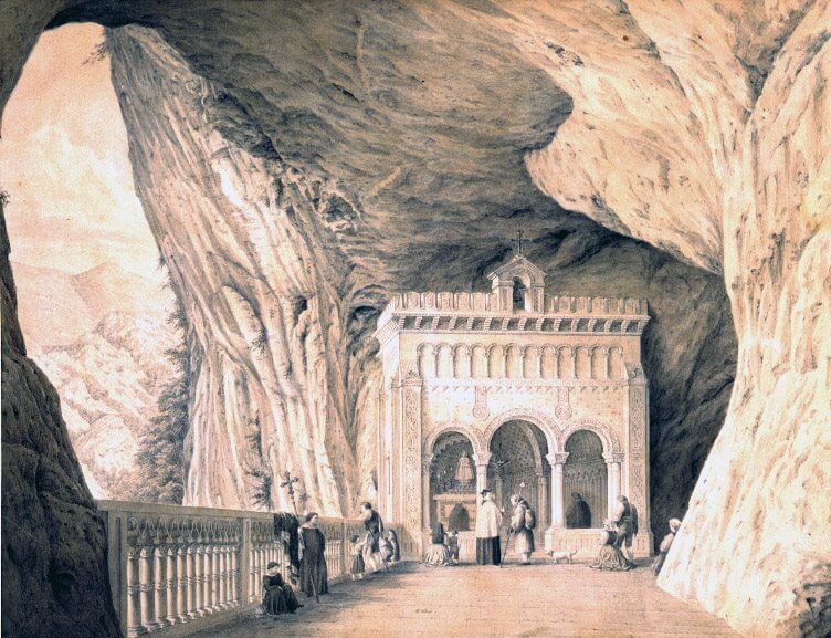 Desde los años setenta y hasta la muerte del obispo Benito Sanz y Forés (1882), Roberto Frassinelli se dedicó casi exclusivamente a trabajar en Covadonga, primero proyectando y realizando el Camarín de la Cueva y la Capilla del Campo del Collado y posteriormente centrándose en la Basílica. En este dibujo del interior de la cueva se puede ver, de hecho, el camarín diseñado por él al fondo, así como varias figuras devocionales en el interior del espacio. Este dibujo, junto con otros sobre Covadonga realizados por Frassinelli, forman parte de una serie que proyectaba editar como estampas el Cabildo.