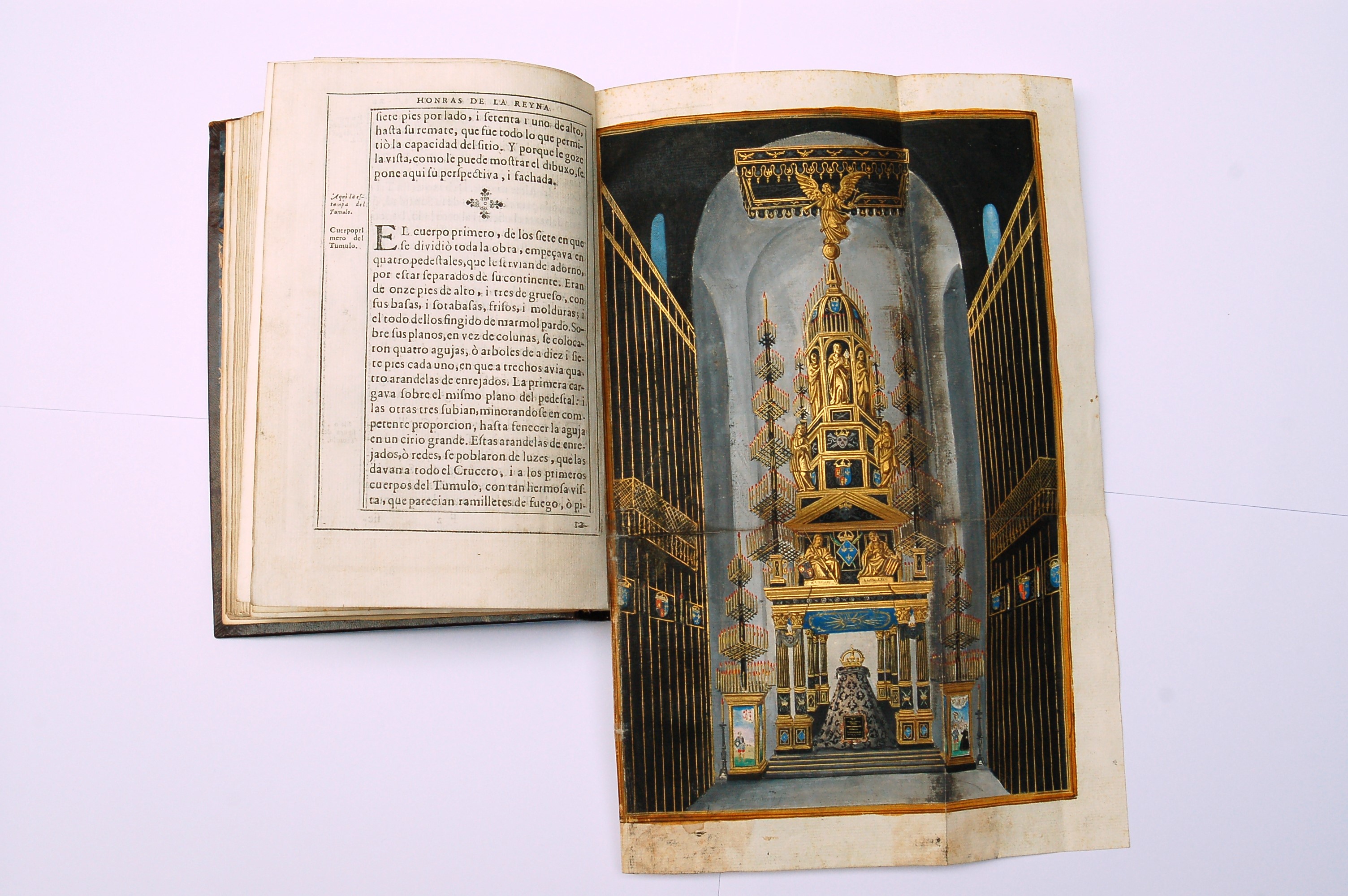 El ejemplar que la Familia Cueto Serrano ha donado al Museo de Bellas Artes de Asturias tiene además la singularidad de que las estampas están iluminadas: un total de doce, a las que se suma una portada arquitectónica. De ellas, hay seis de mayor tamaño que se encuentran plegadas. Sobresalen, asimismo, los grabados del túmulo y de la planta de la iglesia indicando el lugar donde se colocaban los asistentes elaborados por Juan de Noort. Las otras seis láminas muestran veinticuatro emblemas dedicados a la Reina que presentan la imagen de la muerte interactuando con esta figura real de gran riqueza simbólica que cuentan con la particularidad de referir momentos específicos de la vida de la reina.