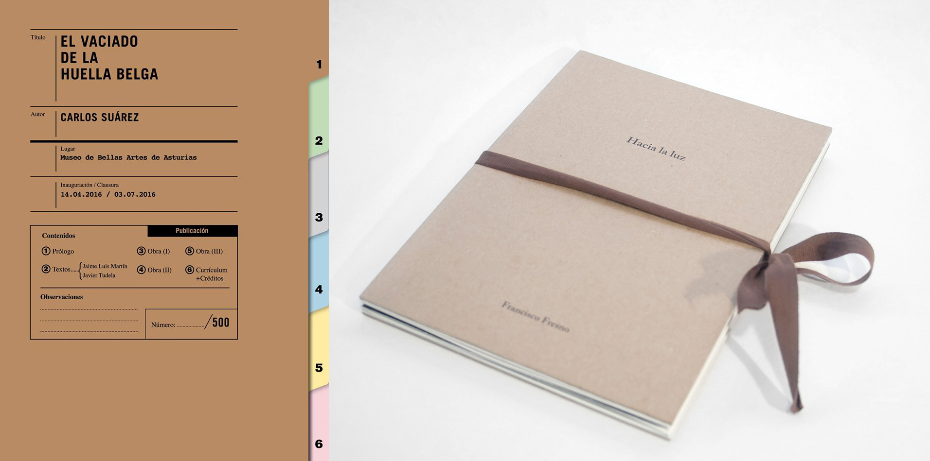 El catálogo de El vaciado de la huella belga, de Carlos Suárez, ha sido diseñado por Manuel Fernández. Compuesto por seis carpetas, se concibe, además de como testimonio de la exposición, como una prolongación de la misma. La exposición trata sobre el recuerdo y el paso del tiempo. Para ello, el artista expone piezas del archivo histórico de “Asturiana de Zinc” en forma de instalación artística. El catálogo, por su parte, toma literalmente la idea conceptual del artista, adquiriendo el aspecto de una carpeta de archivo, donde se clasifican por apartados cada una de las piezas que documentan gráficamente la exposición.