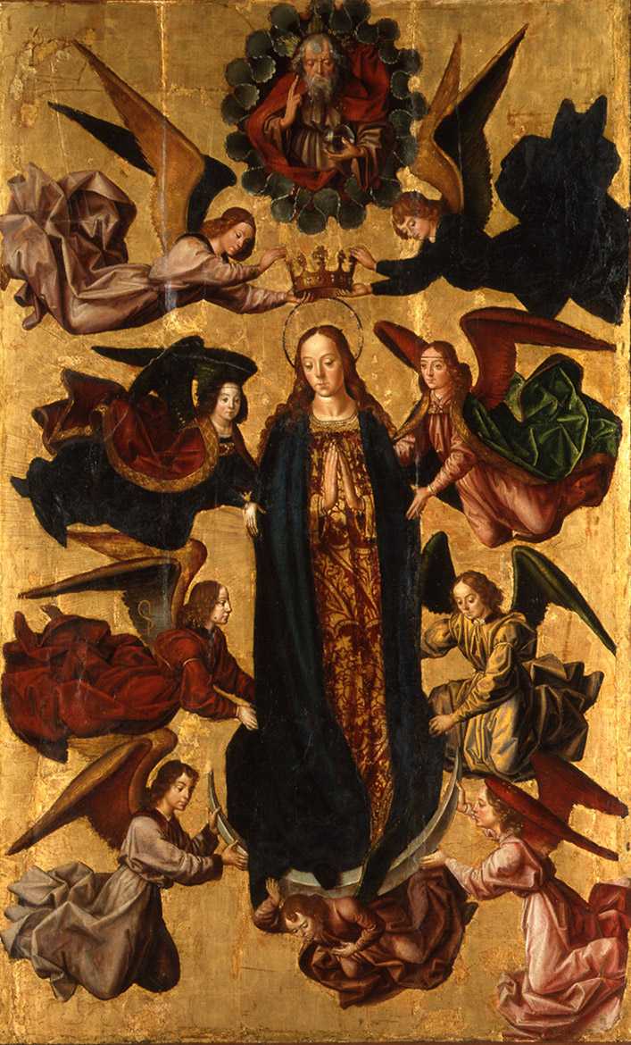 La interpretación del asunto representado es compleja, porque presenta aspectos que se corresponden con la imagen característica de la Inmaculada Concepción, tales como la expresión humilde y de aceptación (los ojos bajos y las manos orantes) y la presentación con el cabello suelto. Se sitúa además en el espacio celestial, rodeada de ángeles y colocada sobre el creciente lunar con los cuernos hacia arriba; elemento que se hará consustancial con el tema de la Inmaculada en el segundo cuarto del siglo XVI. Por lo demás, podría corresponderse también con la Asunción, escena en que aparecen los ángeles ayudando en la ascensión mariana. Suele complementarse con la coronación de María por parte de Dios Padre, a veces ayudado por ángeles o por Cristo.