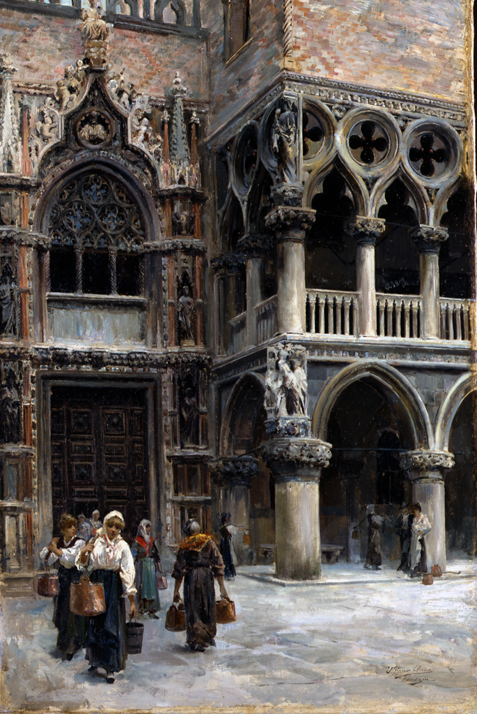 El cuadro representa una escena costumbrista, a la que sirve de fondo el Palacio Ducal: a la izquierda se ve la Puerta de la Carta y sobre la columna en el ángulo de la logia se puede ver el Juicio de Salomón de Nanni di Bartolo. Las aguadoras, con calderos de cobre y baldes de madera y hierro, se disponen en diagonal, ofreciendo así cierto dinamismo a la composición. La atención al detalle se hace patente tanto en la arquitectura como en la policromía y detalles escultóricos y ornamentales. Además, el colorido destaca la sutileza de los tonos grises, entonados con suavidad con los anaranjados y azules.