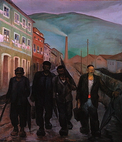 El cuadro muestra a cuatro únicos personajes, mineros, que han acabado su jornada de trabajo. Están representados en un escenario de arrabal semiurbano. Un camino, una montaña y una chimenea son los escuetos elementos, distribuidos en una vertiginosa pirámide óptica que dirige la mirada del espectador desde la semipenumbra marcial del primer plano hasta el clamor simbólico del fondo. La obra destaca, además, por su espléndido estudio de perspectiva lineal y por su elocuente paisaje de fondo.