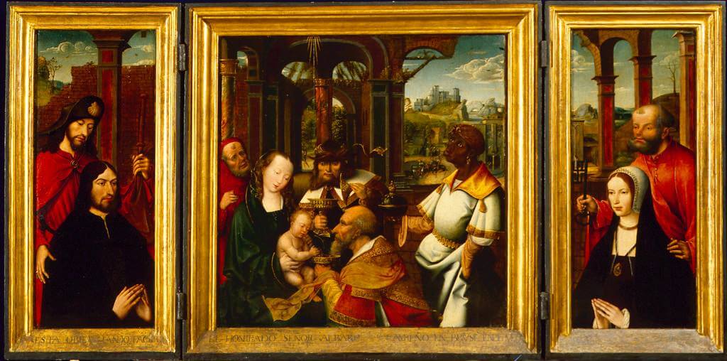 Este tríptico fue realizado al óleo sobre tabla de roble hacia 1520. El Tríptico de la Adoración de los Reyes Magos o de Don Álvaro de Carreño fue realizado en Bruselas por algún artista del Círculo del Maestro de la Leyenda de la Magdalena. En la tabla central se representa la Adoración de los Reyes Magos, mientras en las laterales aparecen Don Álvaro de Carreño, aposentador de Carlos V, y su esposa, introducidos en la escena por los santos Pedro y Santiago, así como una representación de la Anunciación, visible cuando las puertas están cerradas. Aunque su atribución ha cambiado en los últimos años, para saber más detalles pincha aquí.